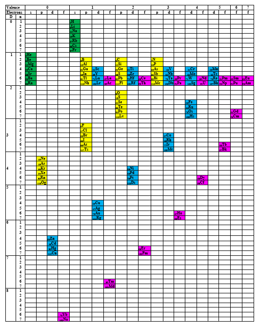 The 3D representation of the periodic village can be plotted as a table in which the columns correspond to valence, with sub-columns showing the orbital occupancy of valence electrons, while the rows represent the number of lone pairs (D), subdivided further by the principal quantum number n.