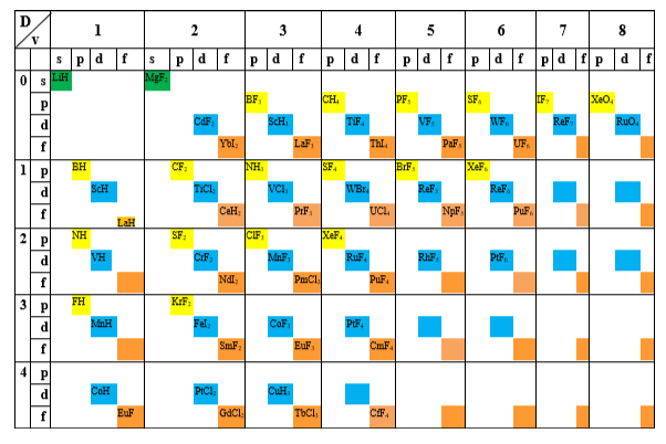 To validate the relevance of the proposed valence dependent Generalized Periodic Table, we have compiled in the following table a representative set of chemical compounds, organized according to the valence of their central atom. Although compounds with certain valence values may not yet be known, their discovery remains possible as our understanding of chemistry continues to advance. Within groups derived from the columns of the standard periodic table, higher valence values are generally associated with elements of larger atomic number (Z).